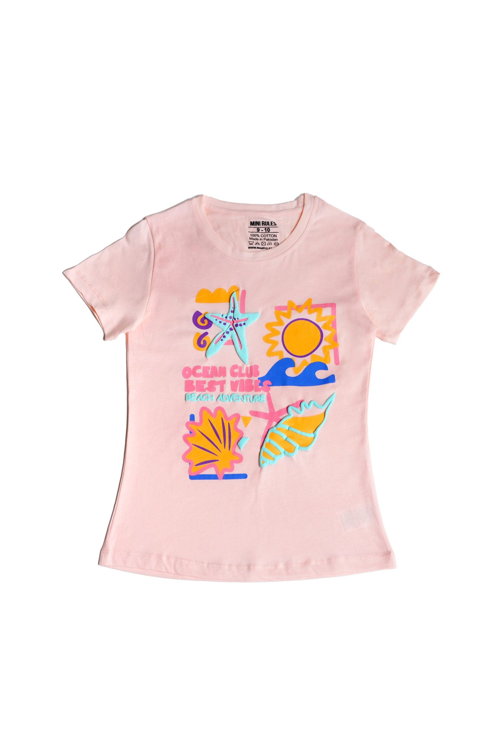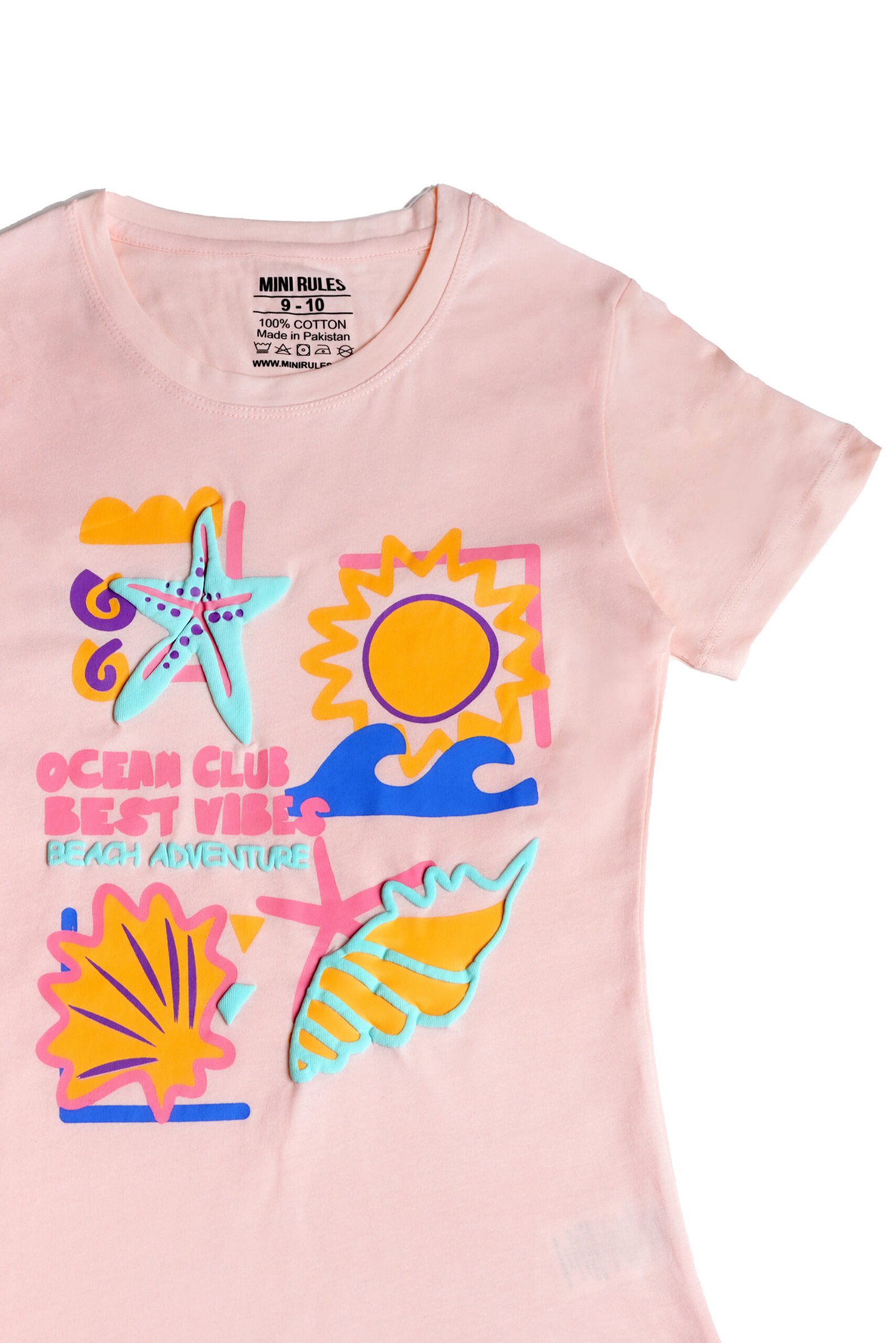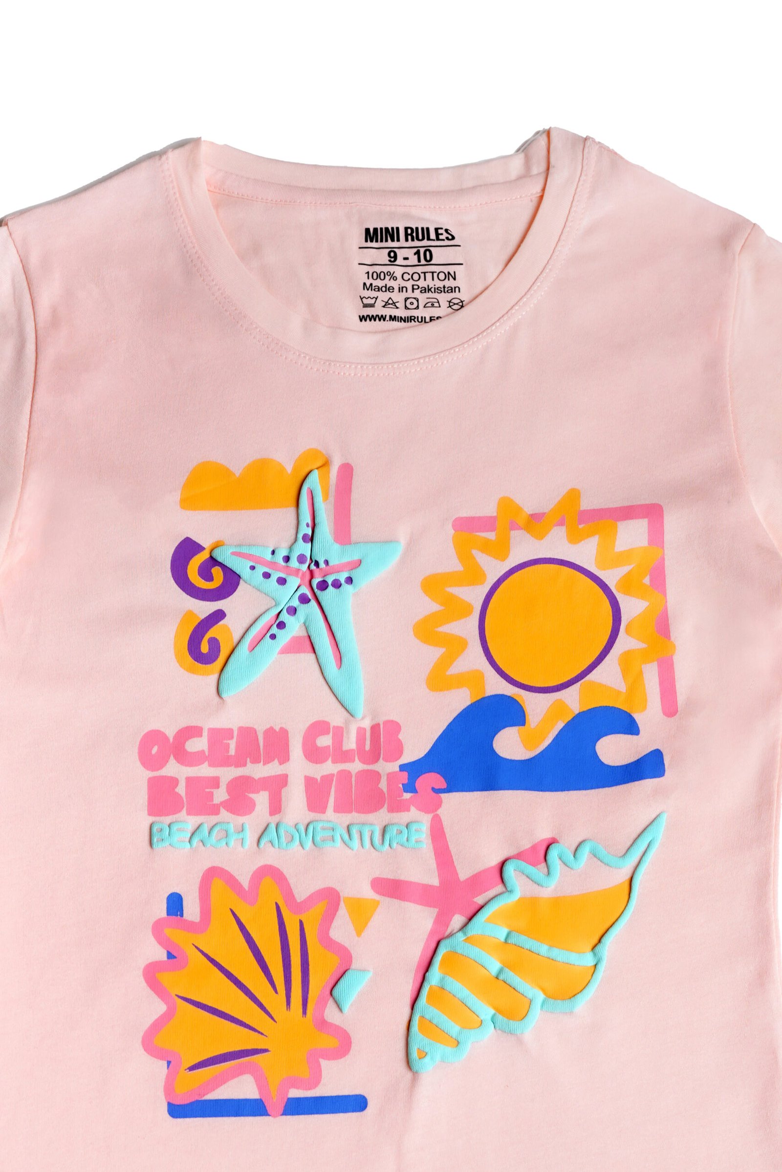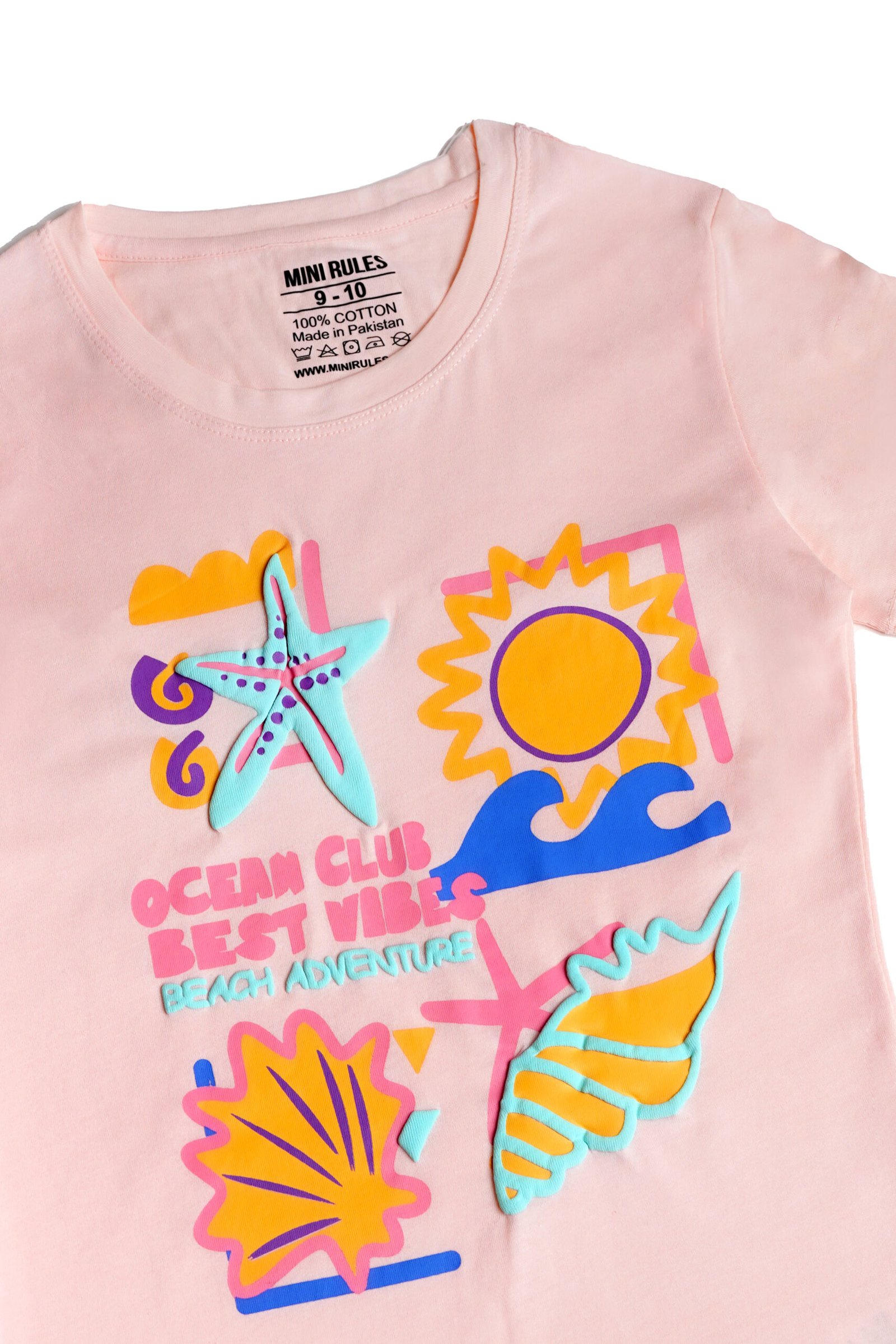 A cute light pink girls’ T-shirt with beachy text “Ocean Club, Best Vibe, Beach Adventure.” Made from soft cotton for all-day comfort. The pastel pink shade adds a sweet touch, while the beachy vibes bring endless fun. Perfect for playdates, outings, and summer fun.