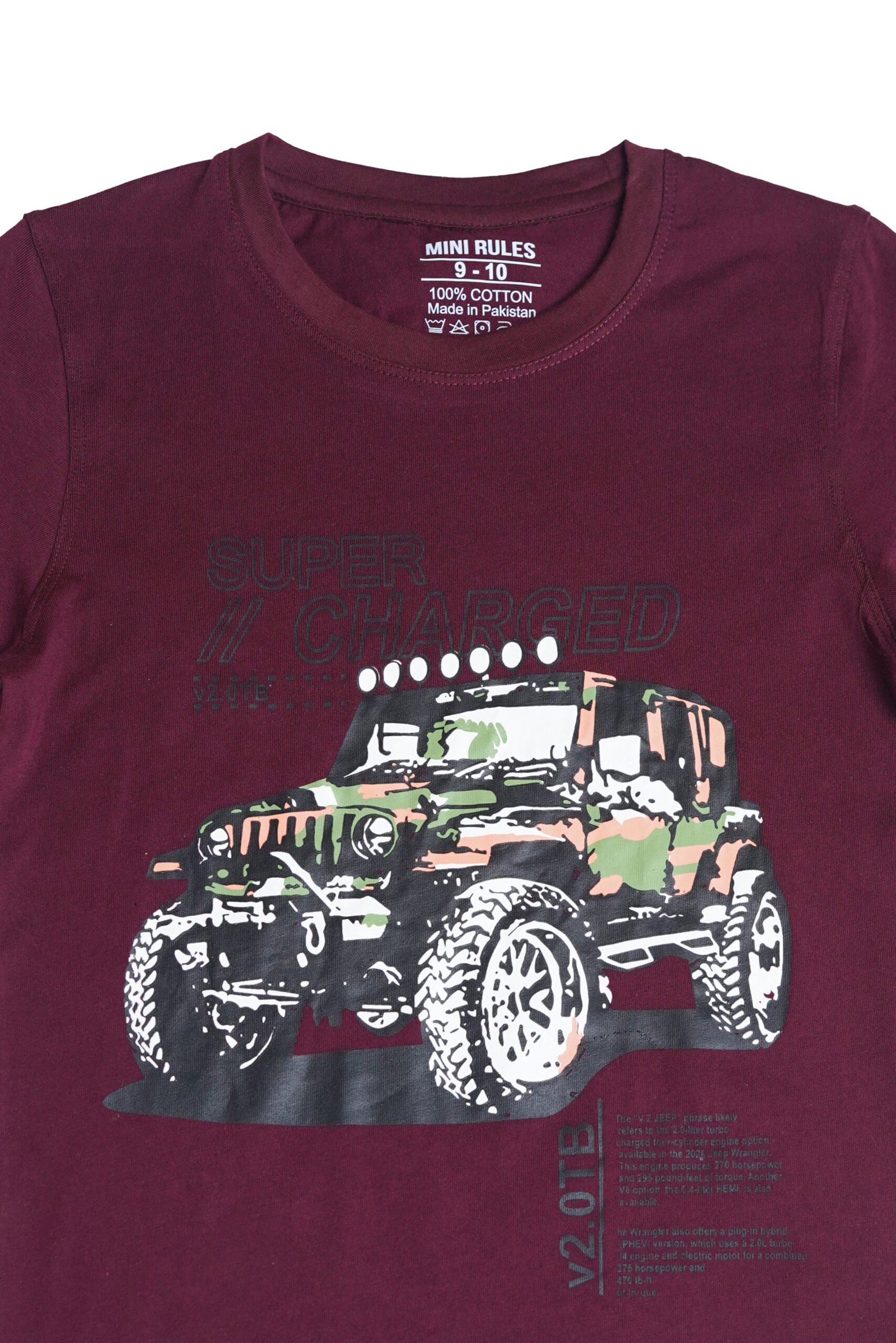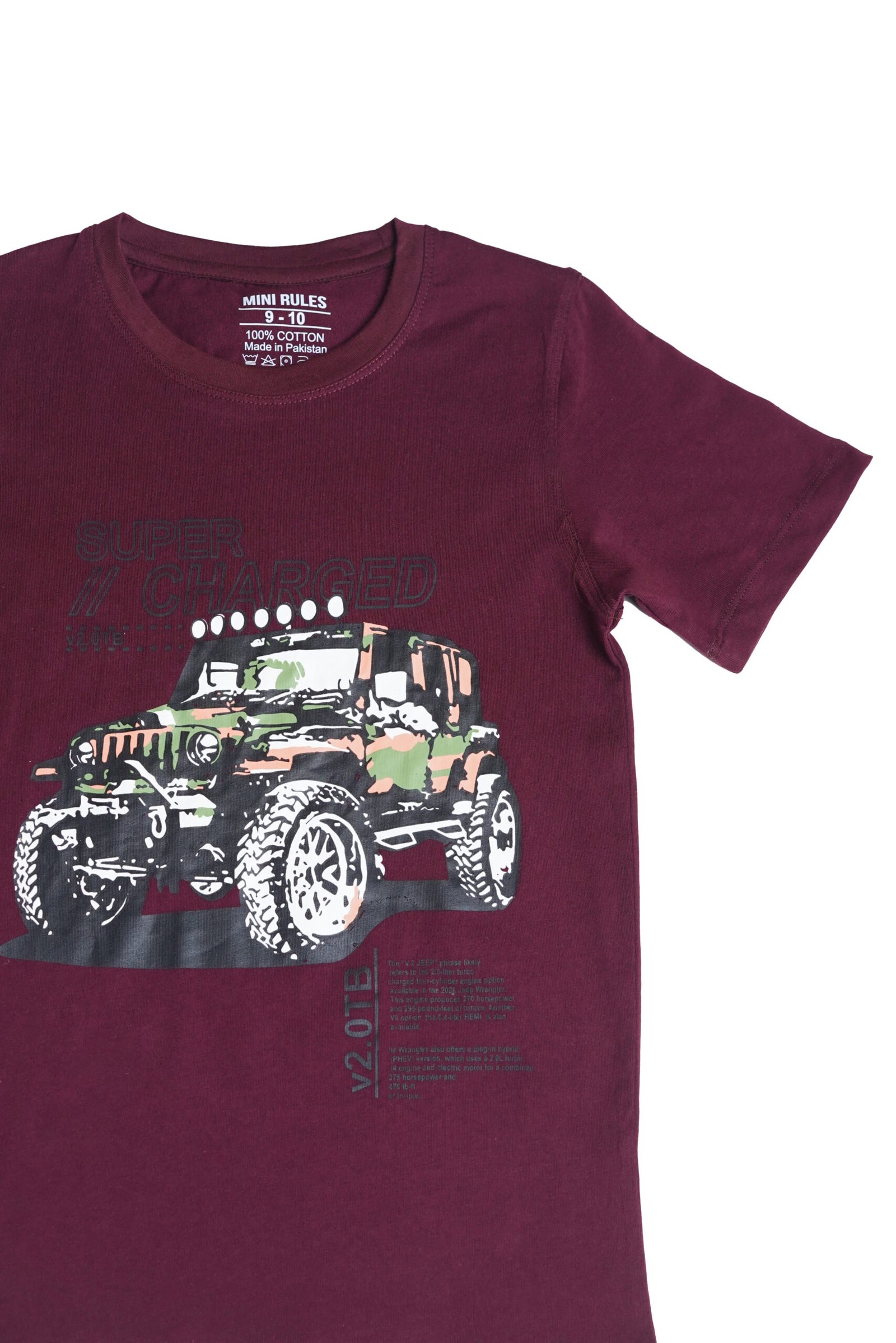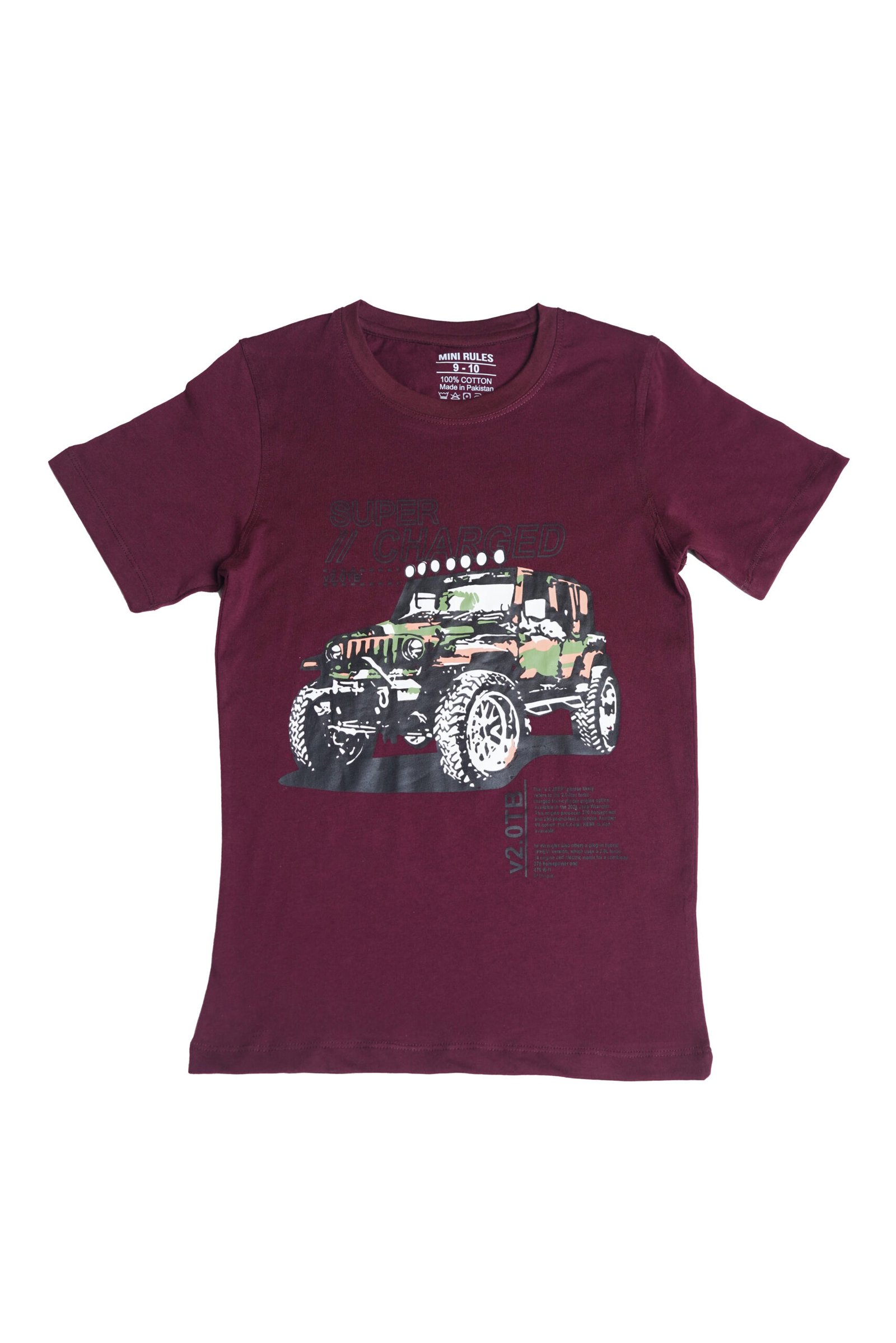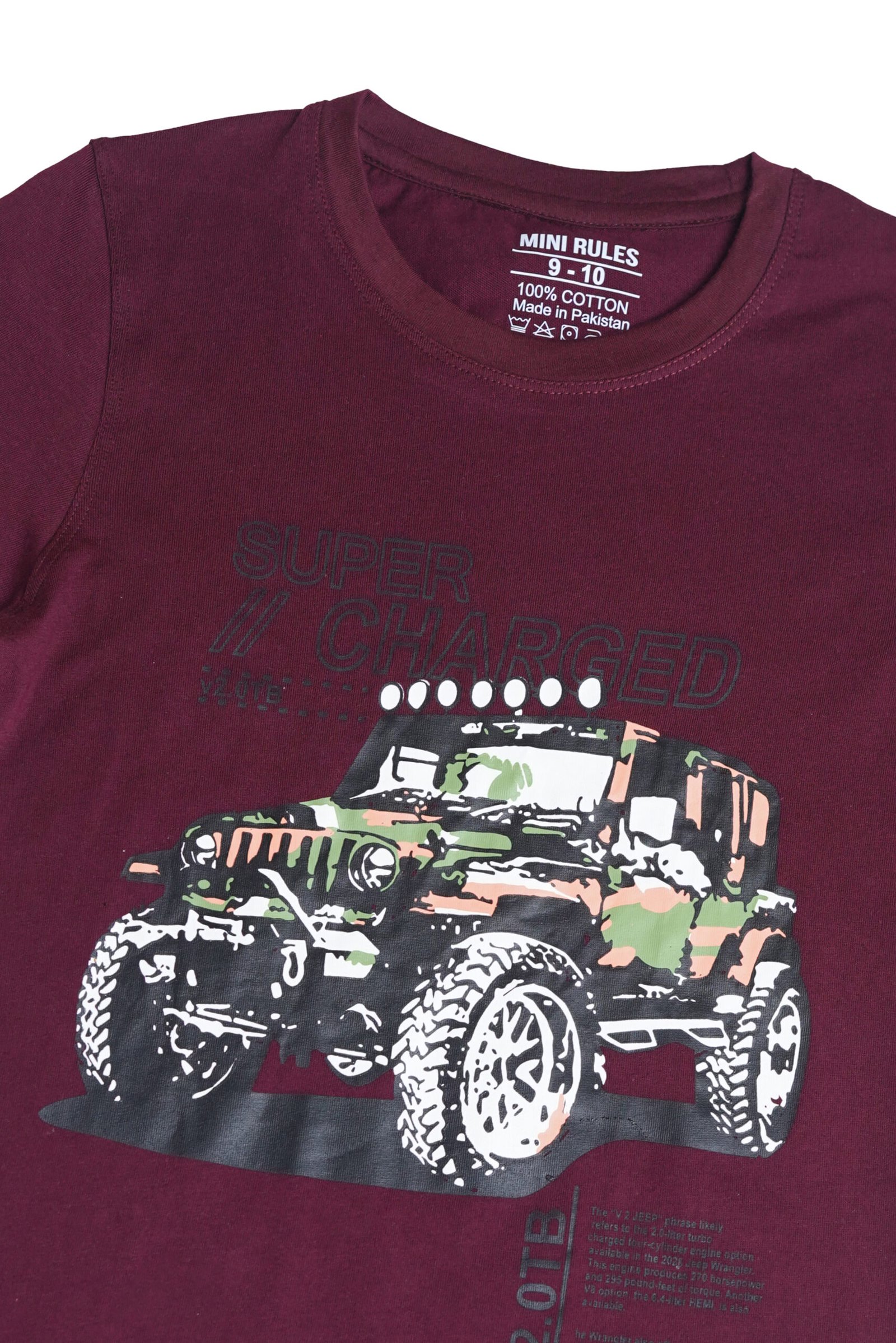 Rev up his style with this bold maroon boys’ T-shirt featuring “Super Charged” text and a rugged camouflage jeep graphic. Designed for little adventurers, it brings a mix of comfort and cool attitude. Whether he’s at play or on the go, this tee adds instant energy to his look.
