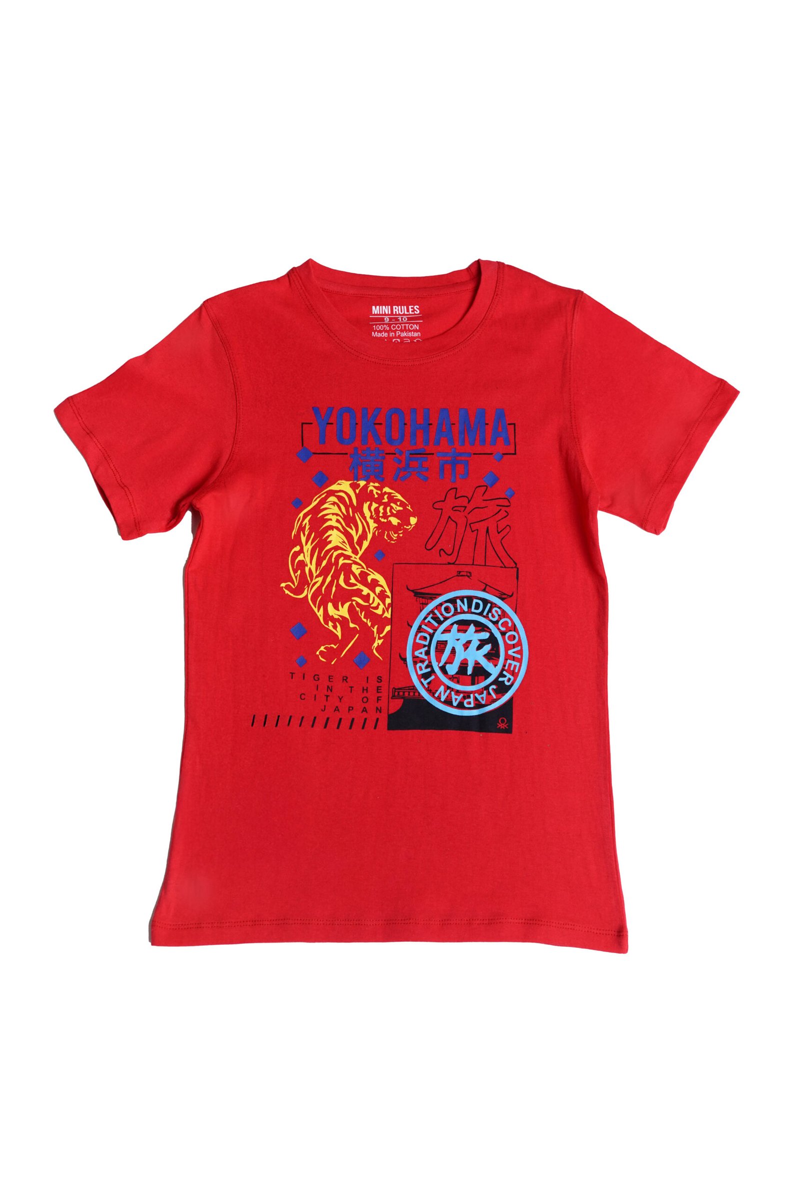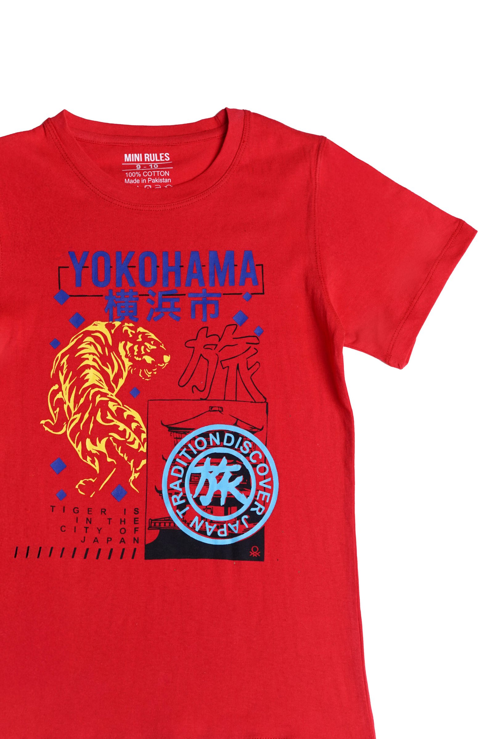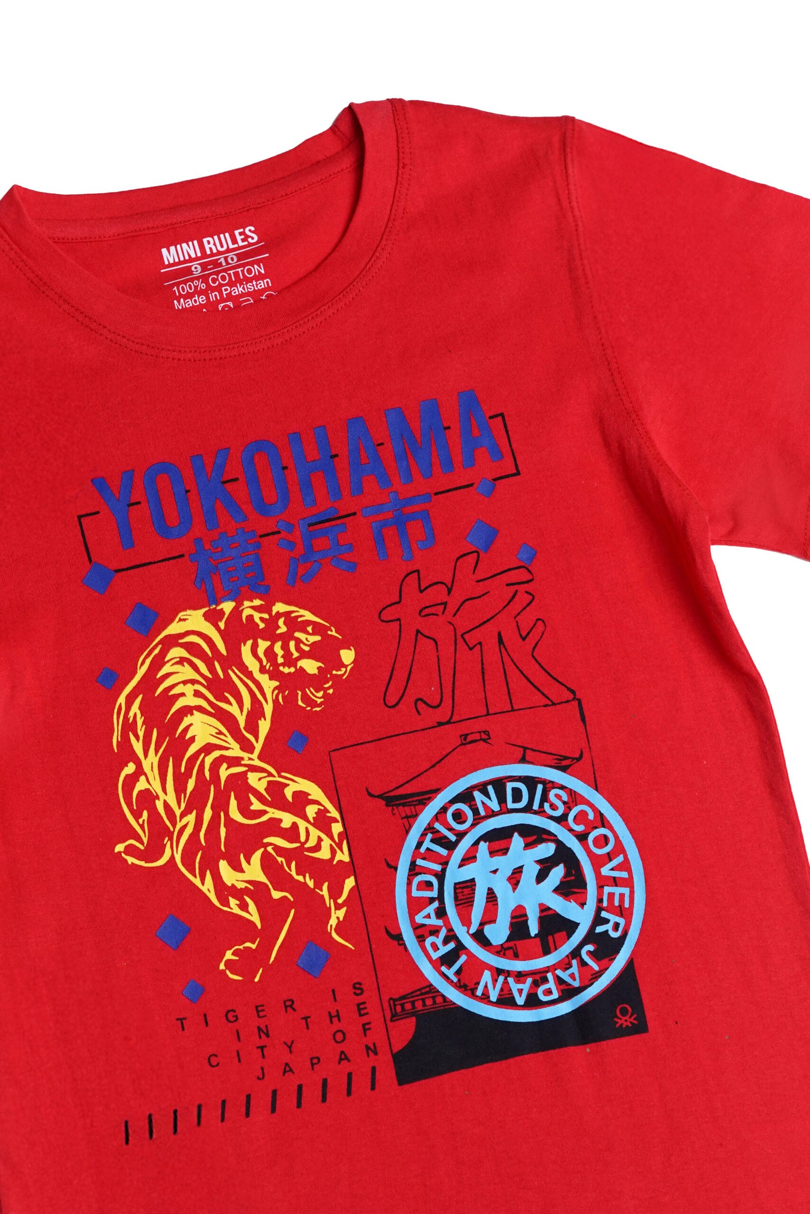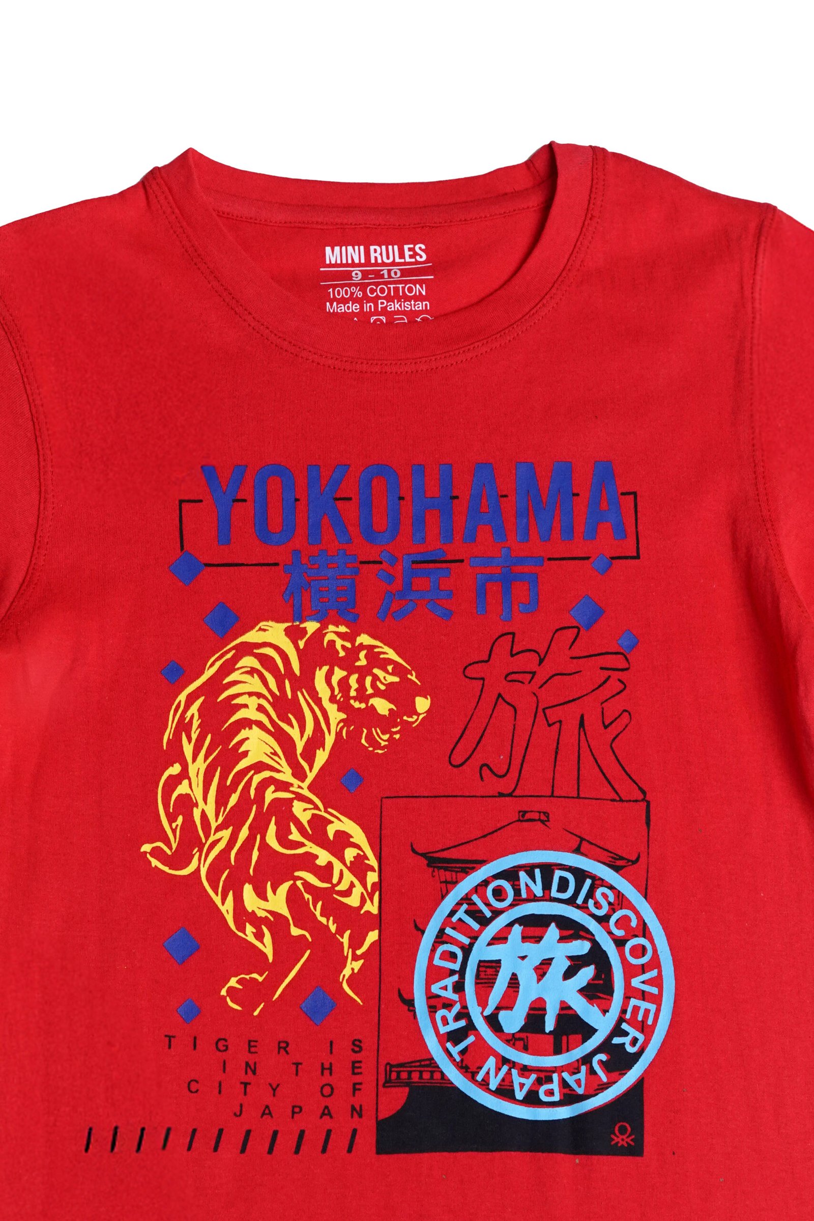 A trendy red boys’ T-shirt featuring bold “Yokohama” text with authentic Japanese symbols for a cool urban look. Made from soft cotton, this tee blends comfort with street-style fashion. Perfect for casual wear, playtime, or adding a touch of Japan-inspired vibes to his wardrobe.